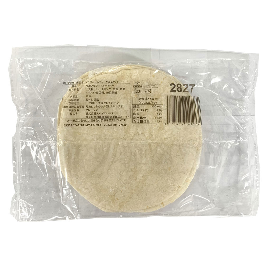 小麦粉を使った冷凍トルティーヤで、直径は6.5inch(約16cm)です。